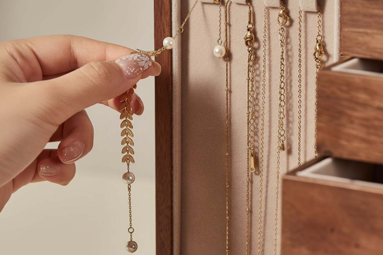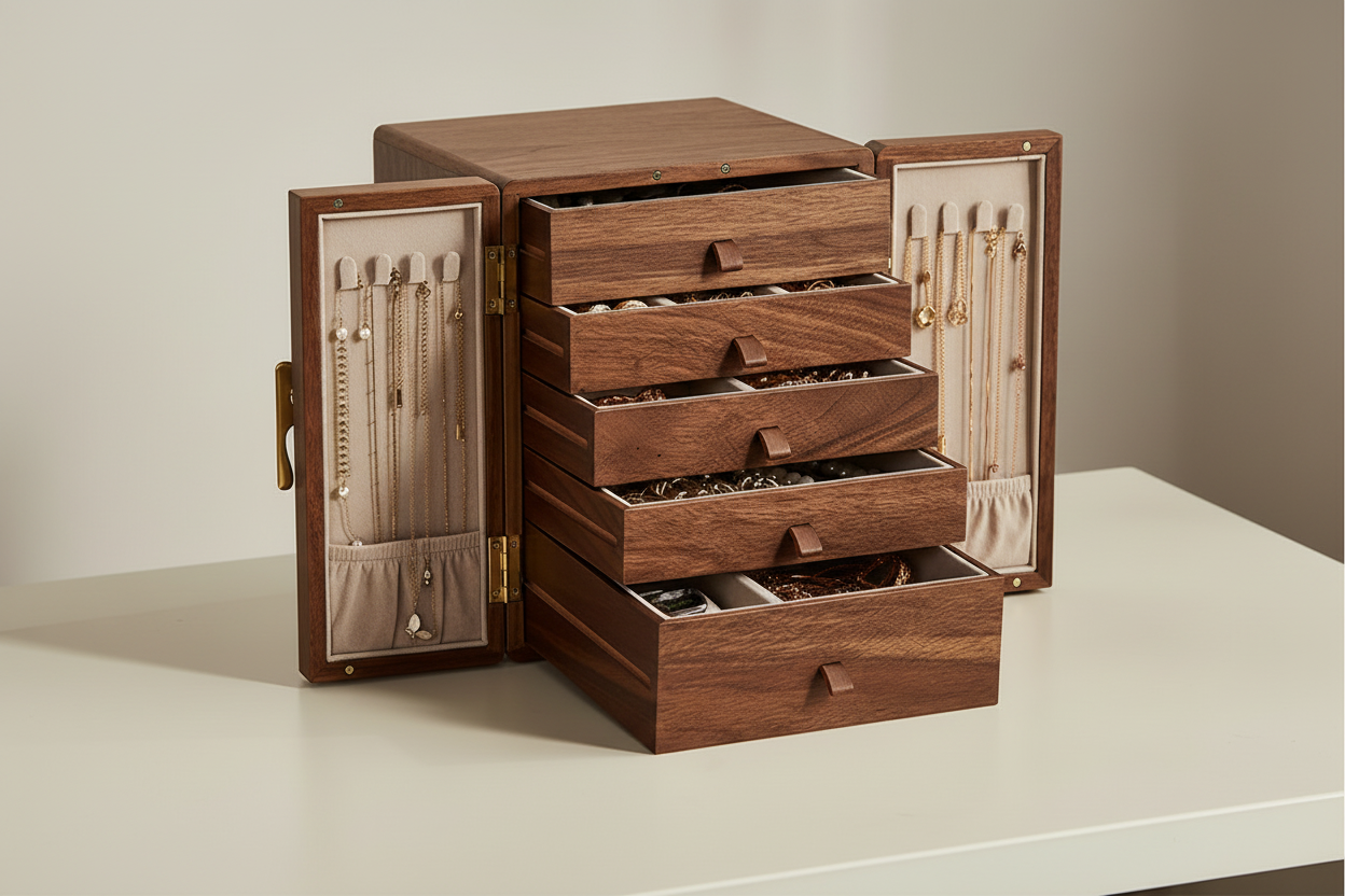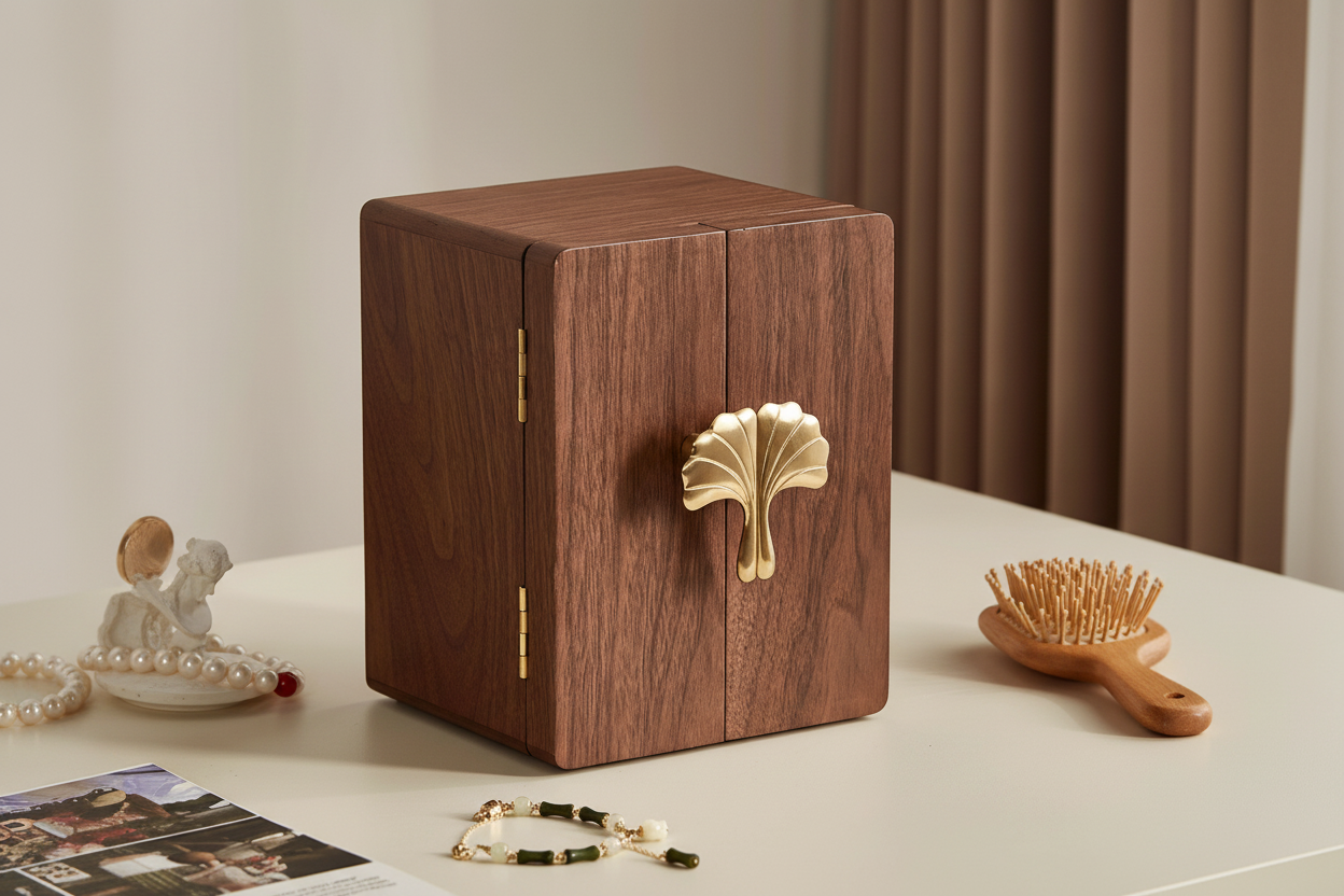 Ahman Walnut Ginkgo Jewelry Box with ginkgo-leaf handle and intelligent storage design. Interior features necklace hooks on doors, velvet-lined drawers with dedicated compartments for rings, bracelets, watches, and studs. Premium zinc-alloy handles with copper plating and leather drawer pulls ensure durability. Eco-friendly lacquer finish. Compact at 8.7" x 7.9" x 10" yet weighs 7.5lb for stability. Perfect for organizing jewelry while adding refined elegance to any bedroom vanity.