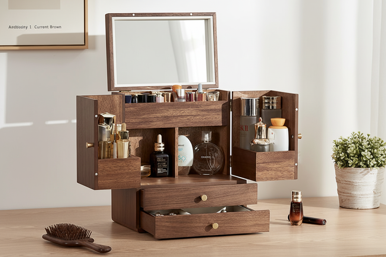 Crafted from strong, waterproof, and moisture-resistant walnut wood, this cosmetic storage box offers a stylish, durable solution for organizing beauty essentials and elevates any vanity or countertop.
