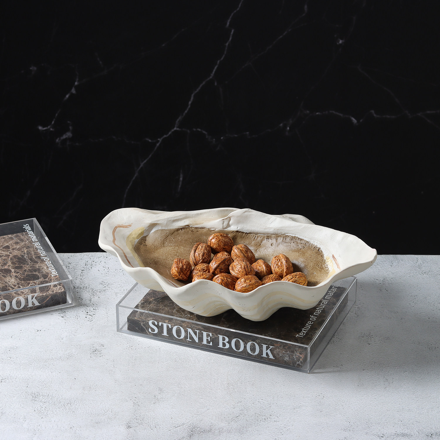 The Cove Faux Shell Resin Tray in light yellow. This durable resin piece mimics aged shell and stone with a shallow concave form perfect for organizing jewelry, keys, or small items. Lightweight and low-maintenance, it pairs seamlessly with Nordic, modern, or retro interiors. Ideal for bedrooms, bathrooms, living rooms, or hospitality displays.